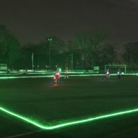 Met oplichtende ballen, gekleurde ”hesjes” en de 4 velden die straalden in het donker leek het wel alsof we midden in een videogame speelden. De spelers renden als lichtflitsen over de velden.